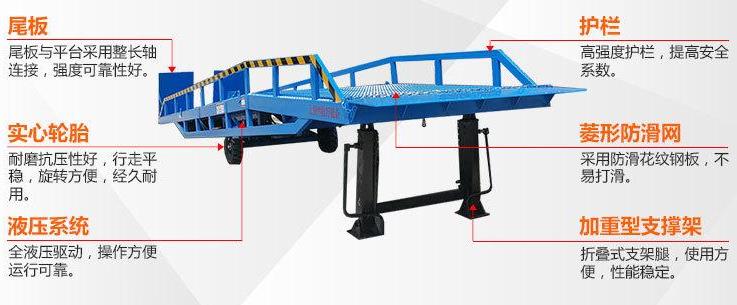 移動式機(jī)械登車橋的特點: 產(chǎn)品應(yīng)用于碼頭、站臺、倉庫等地。可根據(jù)用戶的不同需要,在外形尺寸,承受載荷等方面作特殊設(shè)計。登車橋安裝在貨臺的側(cè)面,與貨臺地面和側(cè)面齊平。登車橋的橋板可上、下傾斜,其外端可高出或低于貨臺平面,使之與車廂等高。