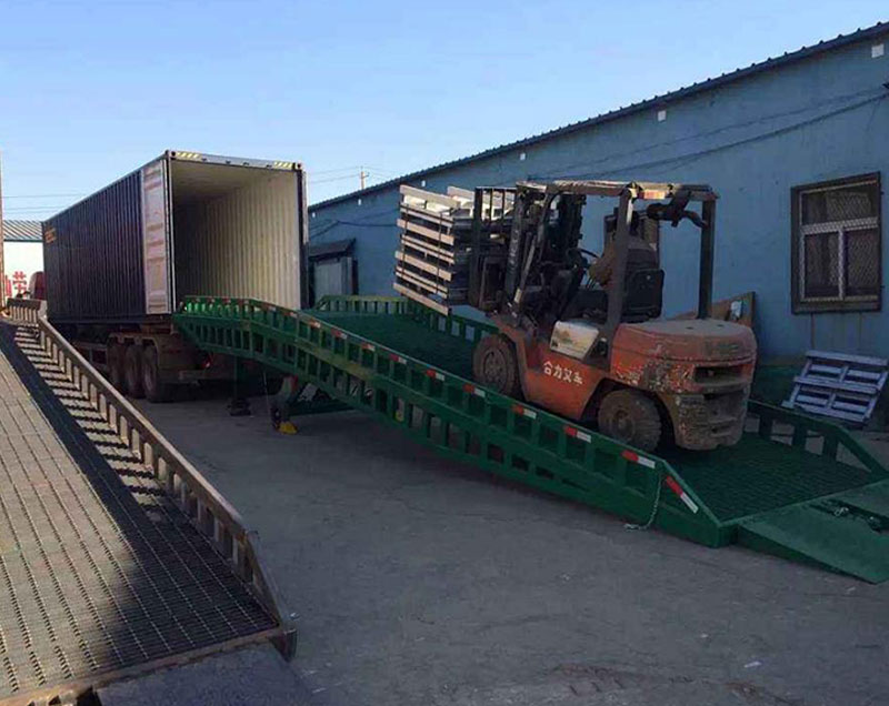 三、進行登車作業前,應先檢查登車橋各部位有無異常。再將登車橋置于空闊、安全的場所,和相應需裝卸的貨柜、車進行安全對接好以后,在貨車車輪下方墊好安全三角木。